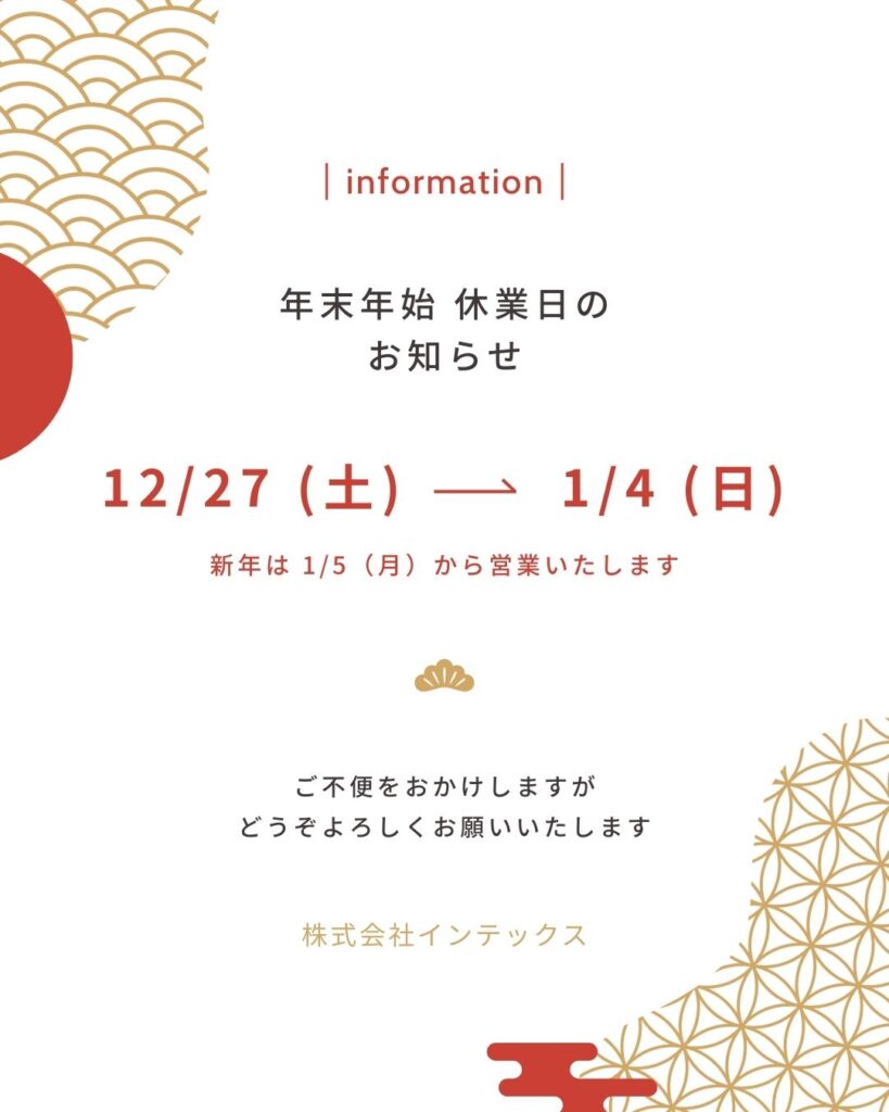 ※休業期間中のFAX及びメールでいただきました、お問い合わせにつきましては、1月5日(月)以降に順次対応させていただきますので、ご了承の程お願い申し上げます