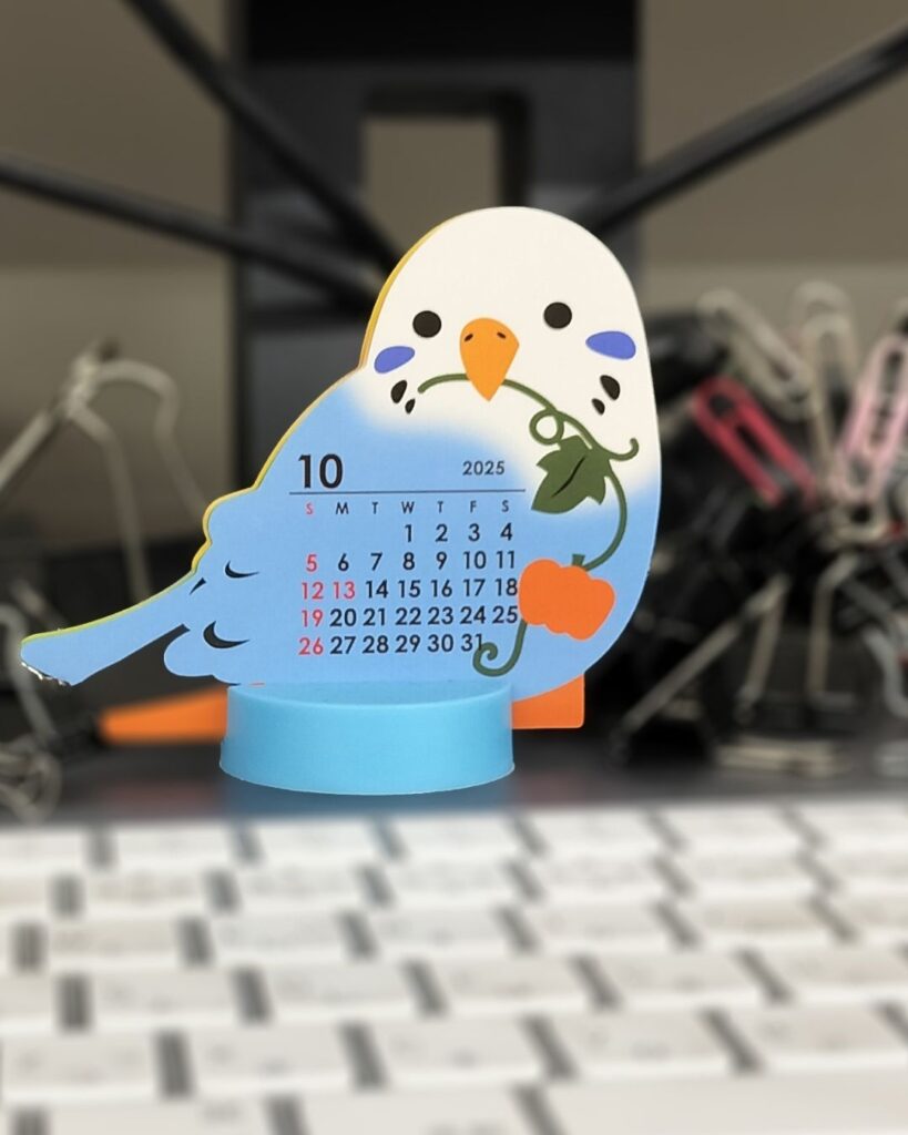 私のごちゃごちゃしたデスクの上には小鳥のかたちのカレンダーがあります。
