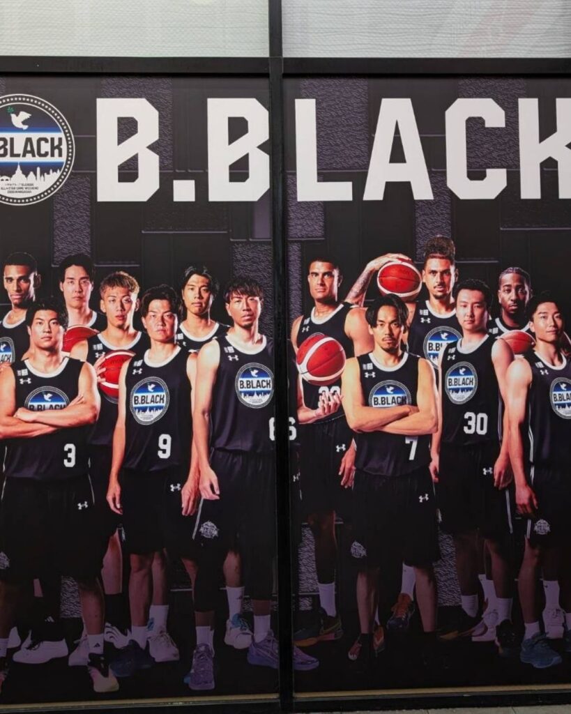 弊社もお手伝いさせていただいた案件ですが、現在も浜の町アーケード(文明堂前)の壁面とAMACROSS411のガラス面に、Bリーグ参加選手の巨大なラッピングや、イラストレーターによるPOPなイラストが展示され、歩行者の皆さんを楽しませています。
